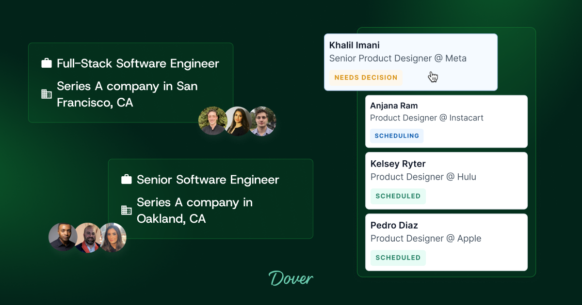 Dover is on a mission to help every company build an amazing team. Every founder and business leader should have the tools and support they need to hire the right talent — fast. Dover combines powerful free software with flexible recruiting services to help startups and growing companies scale efficiently. Dover is built around two core offerings: Free Recruiting Tools: Dover's ATS is a lightweight but powerful applicant tracking system built for busy founders and hiring managers. It’s as easy to use as a spreadsheet but includes everything you need to manage your first 100 hires — without the bloat of traditional ATS platforms. Hundreds of companies use Dover’s free tools to streamline their hiring process and stay in control as they grow. Recruiting Partner Marketplace: When companies need help, Dover connects them with top-tier, fractional recruiters through our on-demand marketplace. Recruiting Partners are experienced, startup-savvy professionals who can step in quickly to manage sourcing, interviewing, closing, and more — without the cost or commitment of an agency or full-time hire. Dover went through Y Combinator in 2019, and today 500+ companies use our product to run a better hiring process. We've raised $23M from top VCs.